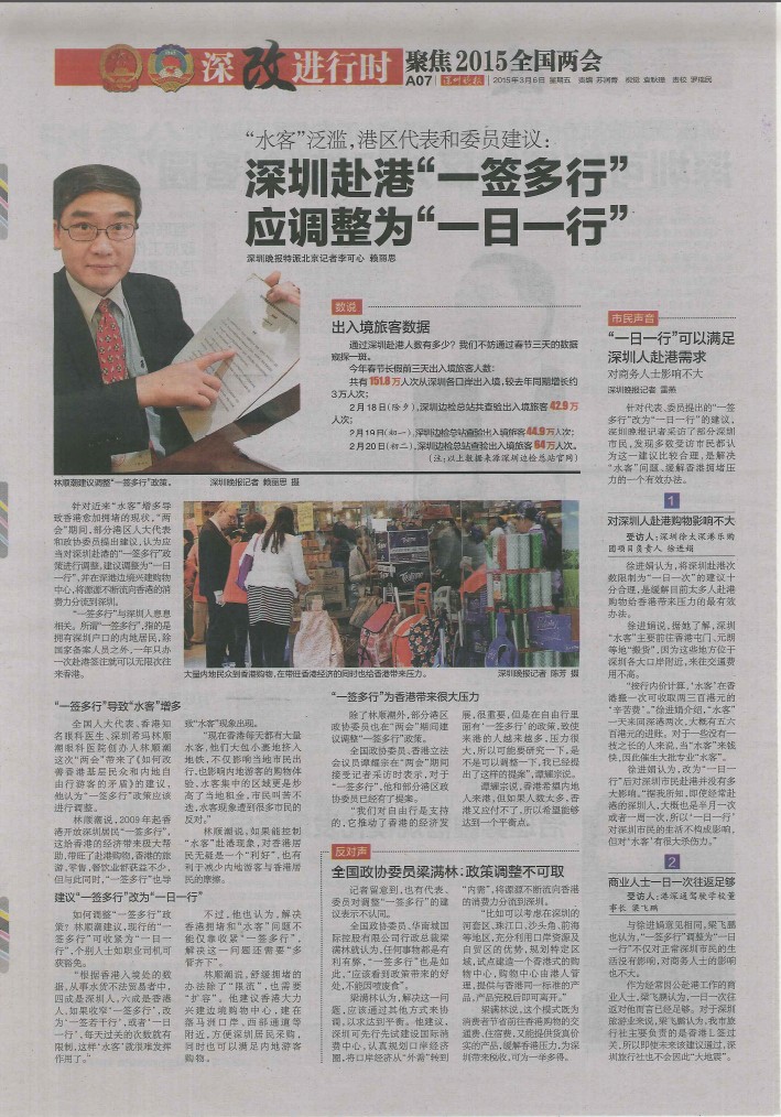 針對近來“水客”增多導致香港愈加擁堵的現(xiàn)狀,“兩會”期間,部分港區(qū)人大代表和政協(xié)委員提出建議,認為應當對深圳赴港的“一簽多行”政策進行調整,建議調整為“一日一行”,并在深港邊境興建購物中心,將源源不斷流向香港的消費力分流到深圳。