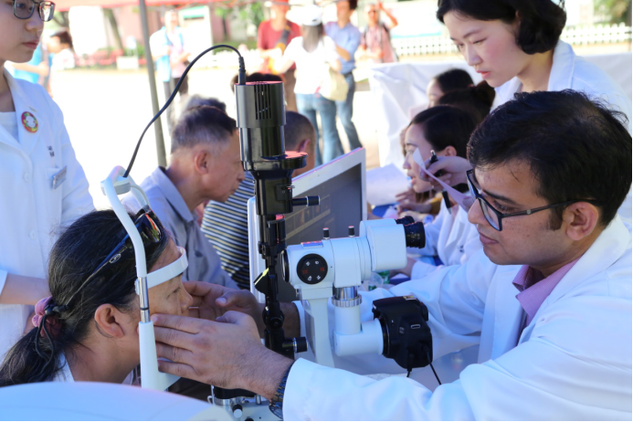 ?,?shù)耐饧t(yī)生尼斯特到社區(qū)為老年人檢查眼健康