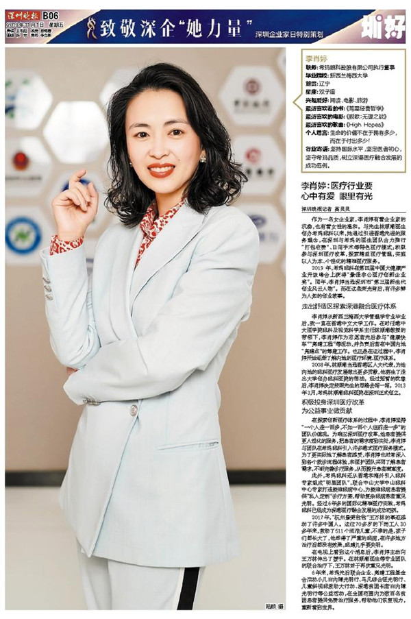 作為一名女企業(yè)家,李肖婷有著企業(yè)家的沉穩(wěn),也有著女性的溫和。與先生林順潮醫(yī)生創(chuàng)辦?,斞劭埔詠恚ㄟ^引進(jìn)香港先進(jìn)的服務(wù)理念,在深圳與?,?shù)尼t(yī)生團(tuán)隊(duì)合力推行 " 打包收費(fèi) "、日間手術(shù)等特色醫(yī)療模式;積極參與深圳醫(yī)療改革,探索精益醫(yī)療管理,實(shí)施以人為本、個性化的精準(zhǔn)醫(yī)療服務(wù)。
