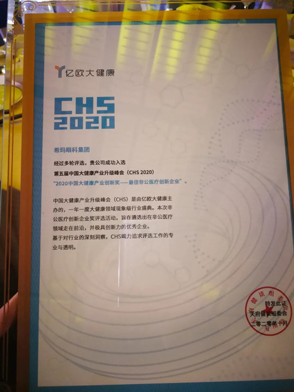 希瑪眼科集團(tuán)執(zhí)行總裁李肖婷受邀參會(huì),并在“非公醫(yī)療產(chǎn)業(yè)論壇”發(fā)表主題演講,?,斞劭萍瘓F(tuán)榮膺“2020中國(guó)大健康產(chǎn)業(yè)創(chuàng)新獎(jiǎng)--非公醫(yī)療創(chuàng)新企業(yè)”。