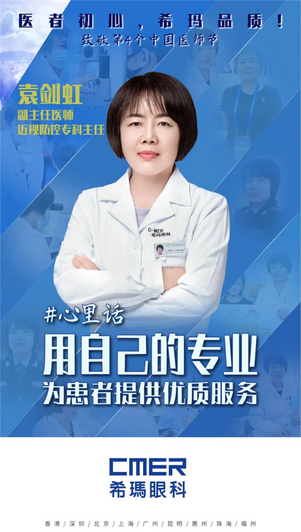 2015年,袁劍虹轉(zhuǎn)業(yè)離開了部隊(duì),逐漸開始轉(zhuǎn)向視光領(lǐng)域,從眼科全科轉(zhuǎn)而專職做小兒及青少年近視防控。2019年,袁劍虹來到了深圳,并加入深圳?,斄猪槼毖劭漆t(yī)院,在近視防控??迫温?。