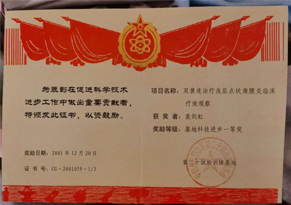 多年來,經(jīng)過不懈的努力,袁劍虹也收獲了頗多的榮譽(yù),主要有:獲評(píng)第二十試驗(yàn)訓(xùn)練基地科技論文、榮獲第二十試驗(yàn)訓(xùn)練基地科技進(jìn)步獎(jiǎng)3項(xiàng)、榮獲軍隊(duì)醫(yī)療成果三等獎(jiǎng)2項(xiàng)等。