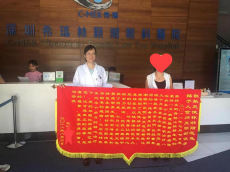 抱著后一線希望,這位患者來到?,斞劭瓶丛\林妙麗。在詢問患者的病史以及做完一系列詳盡的檢查后,林妙麗確診患者是因干燥綜合征引起的葡萄膜炎。同時她也給了患者吃了"定心丸",表示一定會保住患者的眼睛。經(jīng)林妙麗治療半月后,患者視力到0.7,且眼睛紅腫痛等癥狀也逐漸消失。在后續(xù)治療中,患者視力越來越好。為了感謝林妙麗醫(yī)生給予的第二次生命,患者定制了一面超大錦旗送到希瑪眼科,以表感激之情。
