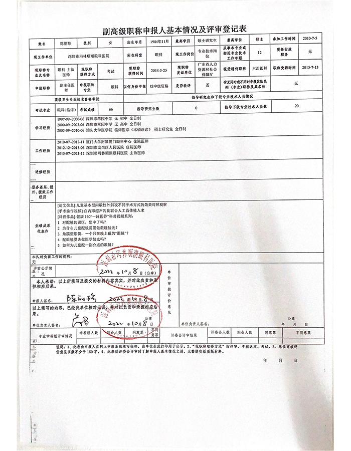 10-07深圳希瑪林順潮眼科醫(yī)院陳麗珍同志專業(yè)技術(shù)人員職稱評前公示