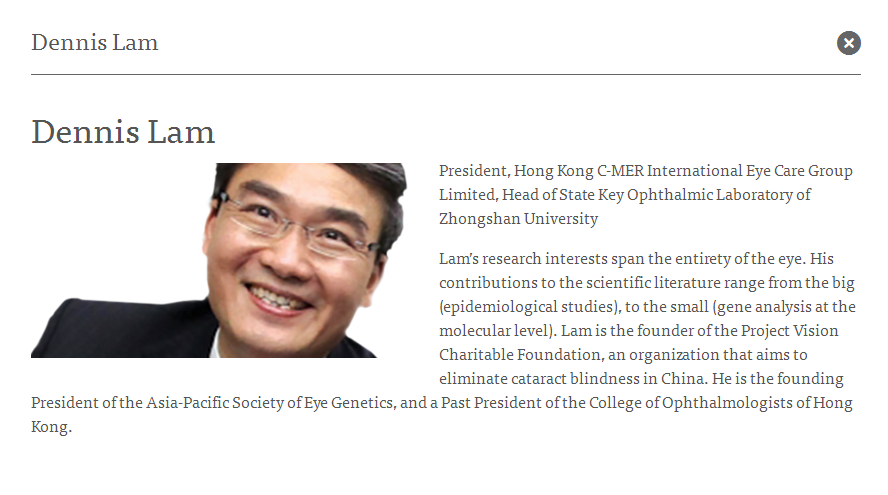 媒體對(duì)Lam評(píng)價(jià):他是香港C-mer國(guó)際眼科醫(yī)療集團(tuán)有限公司創(chuàng)史人,中山大學(xué)國(guó)家重點(diǎn)實(shí)驗(yàn)室主任