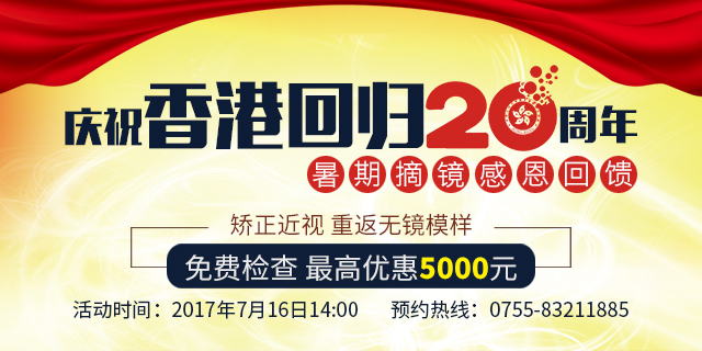 2017年是香港回歸祖國20周年,為了歡慶香港回歸,深圳?,斞劭漆t(yī)院感恩回饋特別推出“歡慶香港回歸20周年·深港市民近視矯正感恩回饋”近視活動(dòng)。活動(dòng)現(xiàn)場設(shè)有專家解疑答惑、希瑪眼科員工摘鏡案例展示、近視手術(shù)患者視頻直播、活動(dòng)抽獎(jiǎng)等環(huán)節(jié),凡是參與活動(dòng)均可有機(jī)會(huì)贏取價(jià)值5000元、價(jià)值3000元、價(jià)值2000元的手術(shù)抵用劵。?